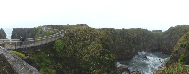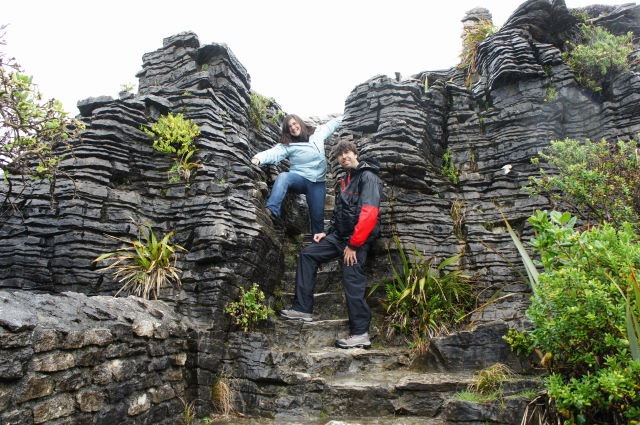Pel camí, hem parat a veure les Pancake Rocks. Són unes roques arran de platja que tenen forma de crepes, posats un sobre l’altre. El dia no acompanya gaire però la foto de rigor no pot faltar!