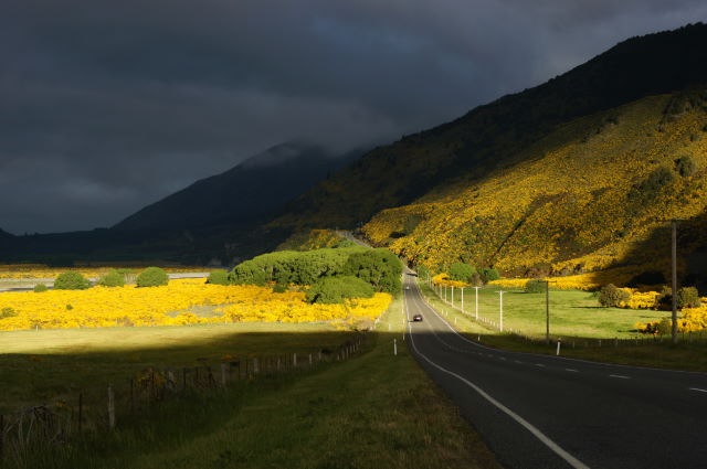 Hem parat a Hokitika a dinar i finalment, després de 8 hores de carretera, hem creuat el país horitzontalment i, de la costa oest, ens hem plantat a l’est. I com és aquest país !!! Ens apropem a on volem dormir, Hanmer Spring, i para de ploure, i aquesta llum tan especial de Nova Zelanda ens regala uns momentets. No hi ha fotografia que la pugui copsar. A més, els camps són plens de “kowhai”, uns petits arbrets que donen brillants fulles grogues i mai hem vist un groc tan llampant a la natura.