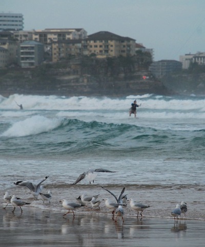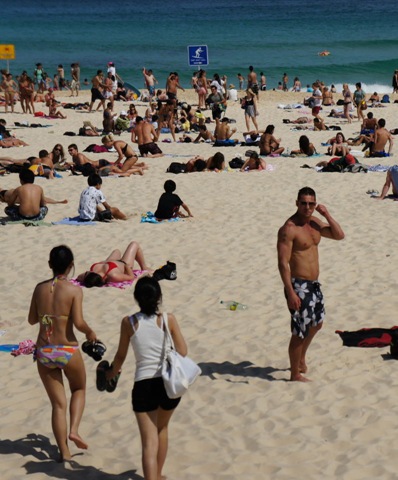 Pero donde de verdad encontramos gente es en la playa. Nos dirigimos a la mítica Bondi Beach, y sólo subir al bus que nos lleva, ya sabemos que estamos en buen camino. Un montón de jóvenes en bañador, chanclas y toallas nos acompañan. El culto al cuerpo se nota. La cantidad de personas que encontramos en la arena es alucinante.
