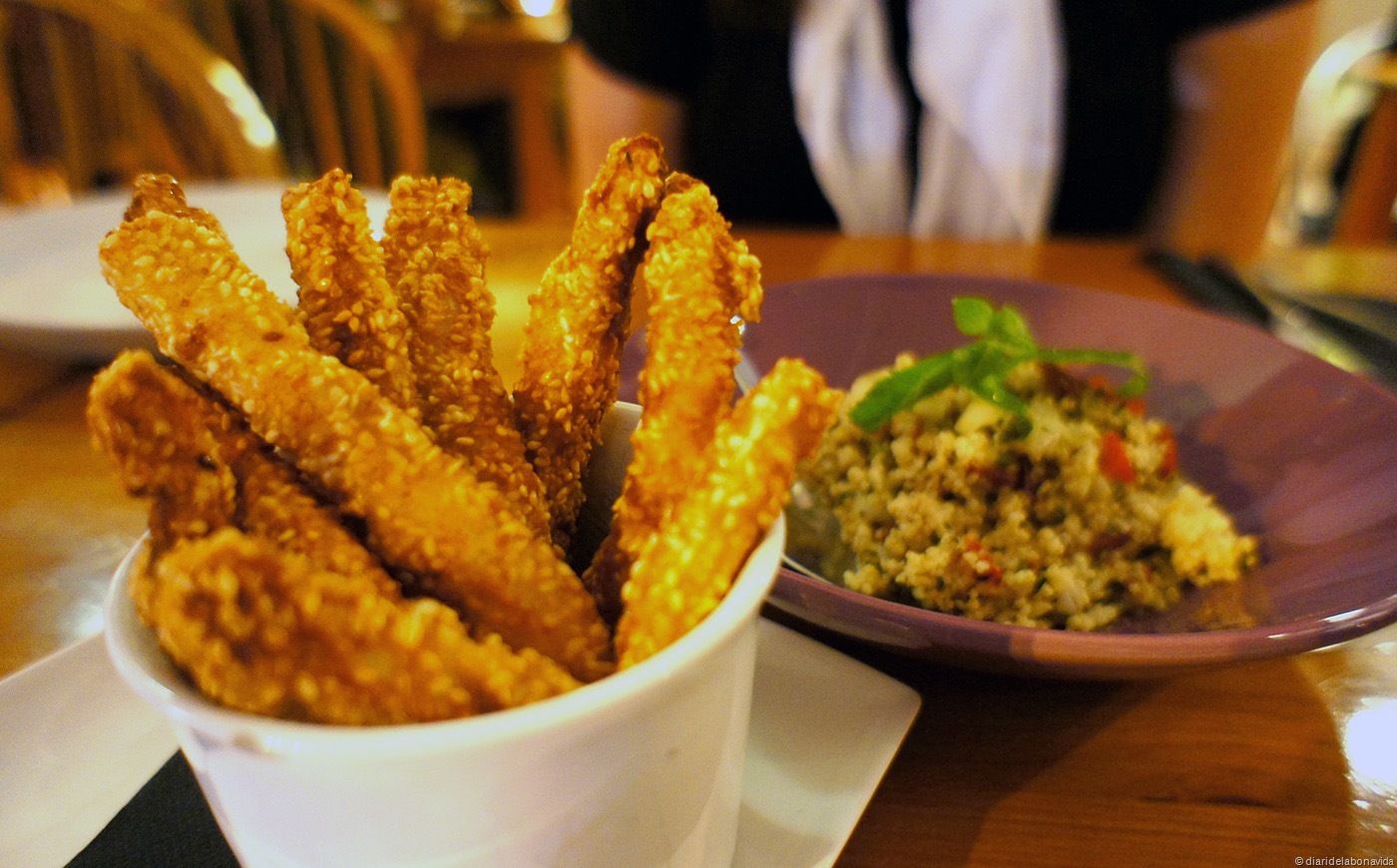 Palitos de pollo rebozados con sésamo y salsa agridulce de chiles y Tabulé