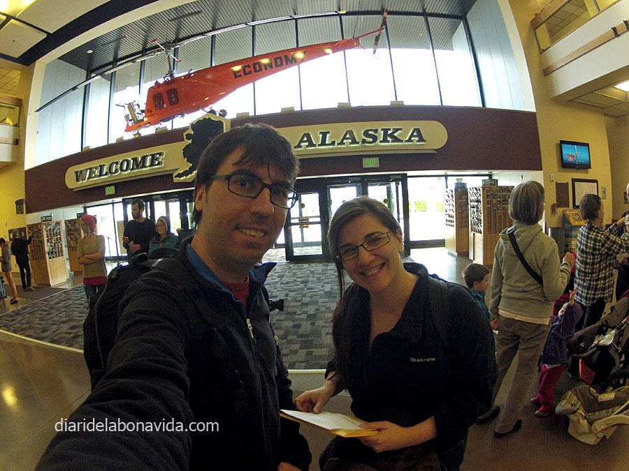 Nuestra nueva aventura comienza muy, muy temprano. Nada menos que a las 4 de la madrugada. Nos pasan a recoger por casa para acompañarnos al aeropuerto, ya que nuestro vuelo sale de Barcelona a las 6:50h. Una vez facturadas las maletas y nosotros embarcados, al cabo de dos horas, llegamos a Frankfurt, donde hacemos una parada de una hora y media, antes de volver a coger nuestro segundo avión, dirección Anchorage, Alaska. Tenemos que pasar otro control de seguridad y esta vez es mucho más exhaustivo que el de Barcelona. De hecho, nos abren la mochila del equipo fotográfico y nos inspeccionan muuuy detenidamente el objetivo más grande (que visto a simple vista, da un poco de miedo …) y el libro electrónico. Pero nada, enseguida ven que somos inofensivos!
