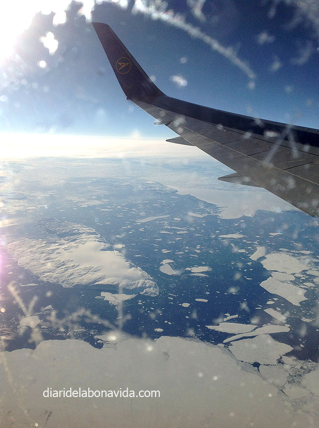 Lo que más nos ha fascinado del trayecto, han sido las vistas que hemos tenido en el momento que sobrevolávamos Groenlandia, cerca del Polo Norte. Espectacular! Parecía que estuviéramos viendo un documental en directo! El mar absolutamente tranquilo y el sol reflejado en los trozos y placas de hielo esparcidas por todas partes. Muy bonito! Sólo faltaban los osos polares corrientes por aquí!