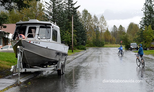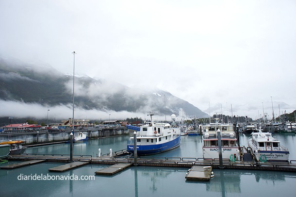 Como decíamos, sufrimos el pequeño inconveniente de viajar fuera de temporada. Llueve durante toda la mañana, y no nos acabamos de decidir si hacer la ruta en crucero visitando el Glaciar Columbia o no (se encarga la empresa Stan Stephens Cruises) ya que el día está muy tapado, y la excursión es un poco cara. Finalmente pensamos que ya que estamos aquí debemos hacerla… Pues cuando entramos en las oficinas para reservarla, nos dicen que debido al mal tiempo y que ya están a punto de finalizar la temporada, han decidido cerrar el servicio de cruceros. Ole!