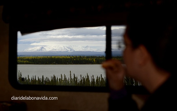Nos hemos arriesgado un poco con la gasolina (bueno, de hecho ha sido cosa mía). Hemos apurado un poco y aquí no encontramos gasolineras en cada pueblo. Es mejor ser previsor y no apurar. Finalmente hemos parado en una pequeñita que hemos visto cuando ya nos veíamos tirados en la carretera. Y lo mismo nos ha pasado a la hora de elegir el lugar donde detenerse a hacer noche. Teníamos previsto un camping en el pueblo de Glennallen, pero lo hemos encontrado cerrado (sí, otra vez el tema de viajar fuera de temporada…). No sufríamos mucho, porque podemos detener la caravana en cualquier rincón y dormir, pero nos gusta hacerlo a zonas de acampada señalizadas.