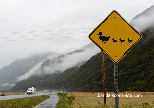 Cambio de planes. Deshacemos parte del camino de ayer y salimos de Valdez. Antes, volvemos a conducir por Dayville Road, la carretera que bordea la costa (donde ayer pudimos ver un oso). Pero aparte de muchas gaviotas y algún león marino no vemos nada más.