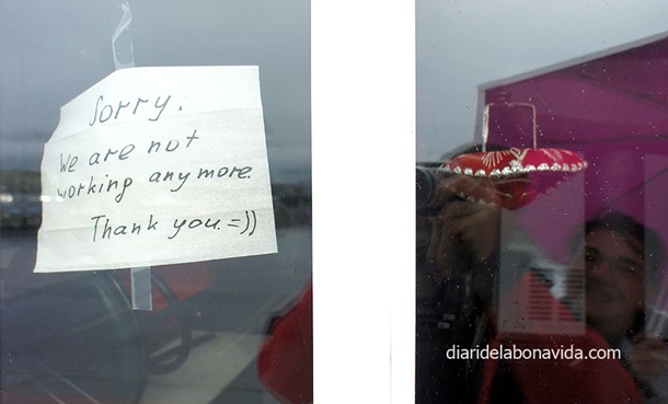 Muchos carteles de «cerrado» (parecen 2 fotos, pero es 1 separada por el marco de la puerta…)