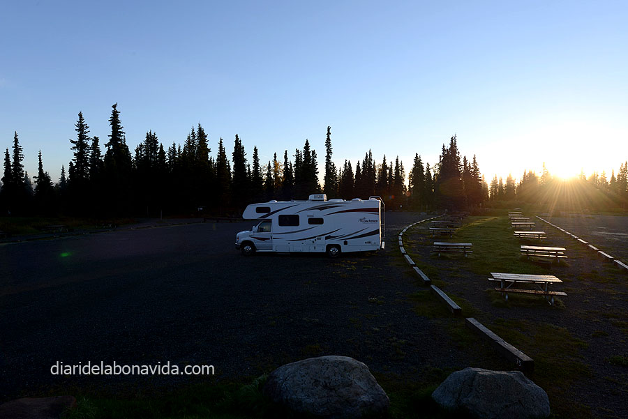Nos instalamos en el camping Driftwood Park, con vistas al mar. Es uno de los más completos a nivel de servicios, pero también los más caros (41 dólares/noche). La media de precios durante nuestra ruta va de los 10 dólares en las zonas de acampada más sencillas, hasta los 35 los más completos, pasando por no pagar nada en diferentes zonas libres. Pero todavía es pronto y no podemos parar quietos. Conducimos por todas las calles del pueblo para ver qué nos ofrece. Pasamos por el bonito lago Beluga, donde están las diferentes compañías que organizan excursiones. Está lleno de hidroaviones. El pueblo tiene otra zona de actividad, llena de restaurantes y tiendas, la Homer Spit. Es una lengua de tierra que se adentra sobre la Bahía Kachemak. Bonita. Una estrecha carretera con agua a ambos lados (más o menos alta, dependiendo de la marea), y donde podemos ver algunos animales marinos. Nos dicen que es un buen lugar donde ver águilas, pero no encontramos ninguna.