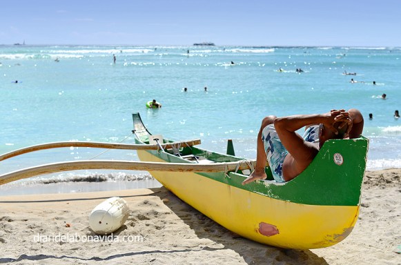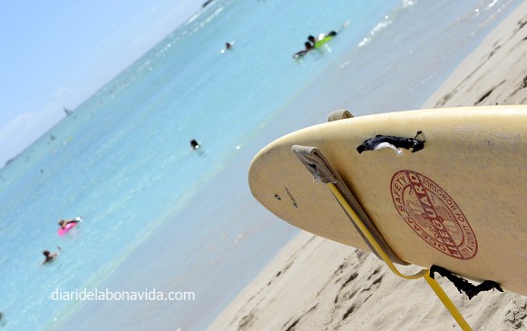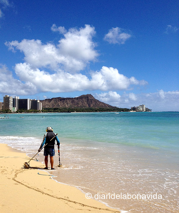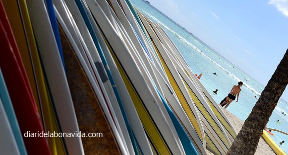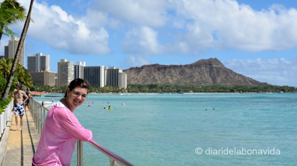 I ens aixequem al matí amb ganes de tornar a trepitjar Waikiki, amb un sol radiant. Caminem pels quilòmetres de sorra fina, aturant-nos a cada moment per observar als banyistes, algun esporàdic surfista, als que prenen el sol… a tothom! Ens agafem la ruta per Hawaii com un relax total, i no volem saber res de presses ni estrés. Un munt d’hotels disposen de piscina amb vistes directes al mar, i molta gent gaudeix del sol. Caminant per la vora de l’aigua, a vegades costa saber quan estàs dins un hotel o és platja pública. Molts restaurants també tenen les terrasses a prop del mar. A mig matí ja ens hem de canviar de samarreta, perquè suem de valent, però estem encantats de poder gaudir d’aquestes temperatures. Banyador, xancles, sorra, mar… que més es pot demanar!