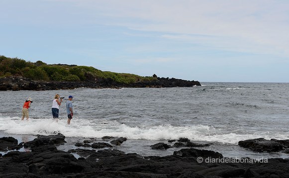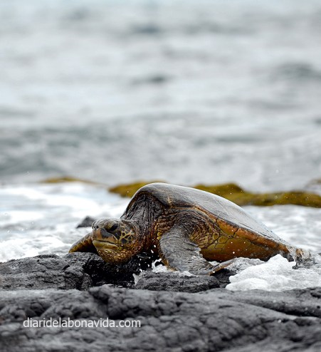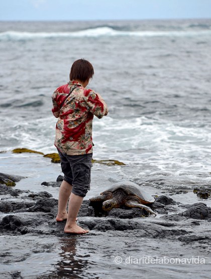 Conduïm per la Hwy 11, direcció Sud, fins arribar a una de les platges més conegudes, la  Punalu’u Black Sand Beach. Com el seu nom indica, és una platja d’una bellíssima sorra negra, on és fàcil veure tortugues marines. Estem una bona estona passejant i gaudint d’aquests animals, intentant fer alguna foto decent, ja que, encara que són lentes, la majoria del temps el passen sota l’aigua. Primer intentem fotografiar-les quan, de tant en tant, treuen el cap a la superfície, però més tard, tenim la sort de veure com alguns enormes exemplars surten a descansar sobre les roques.