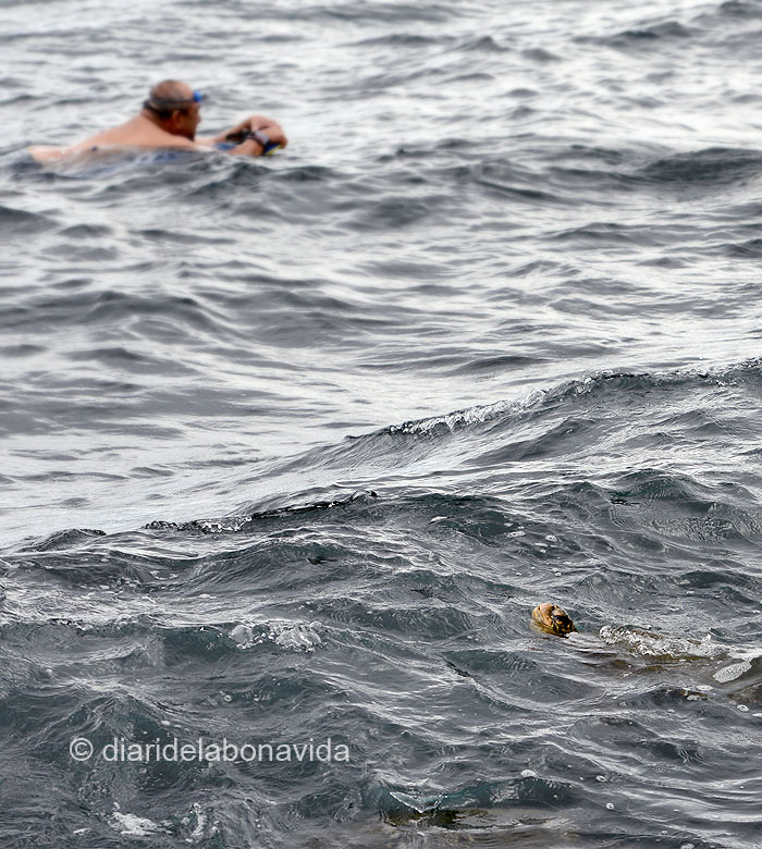 La foto a la que fas referència, Núria, va ser un cop de sort. Després de diferents intents (sense sort), de capturar el moment on la tortuga treu el cap, finalment va coincidir aquest instant amb un banyista que passava a prop.