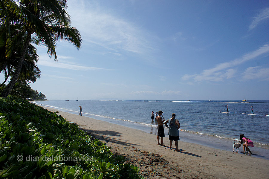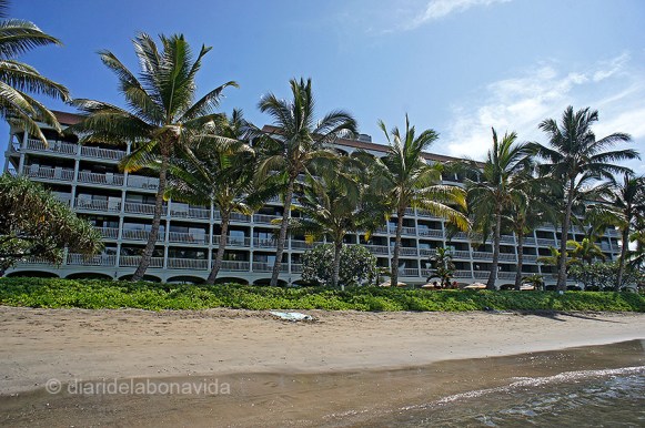 Amb la panxa ben plena, comencem a tirar cap a Lahaina, que és el poble on volem passar les tres nits que serem a l’illa de Maui, tot i que encara no tenim hotel reservat! Ahir vam estar remenant per internet i vam veure un Resort que feia molt bona pinta, tot i que era una mica car. Vam pensar que ens mereixíem uns dies en un hotel de «luju». Ens acostem directament a veure què tal és i ens decidim a entrar. És el Lahaina Shores i per fora sembla bastant normalet. (veure la nostra opinió a Tripadvisor). Res a veure amb la web… Demanem preus i si podem veure les habitacions. Ens donen dues claus: una, per veure l’habitació amb vistes al mar, i l’altra, per veure la que té vistes a la muntanya. Vosaltres mateixos! Agafem l’ascensor però tan bon punt marxem de la recepció, no ens recordem dels números d’habitacions que ens han dit… La clau té un número com codificat i aquest simple fet es converteix en una aventura laberíntica per les més 200 habitacions del complexe. Després de voltar per totes les plantes i preguntar a les senyores de fer feina, trobem les habitacions en qüestió. Són mini apartaments, amb una mica de cuina, però tot i estar bé, no són tan espectaculars com ens pensàvem. El millor és que l’hotel té sortida directa a la platja. Com que ja comença a ser una mica tard, no ens volem arriscar a no tenir hotel aquesta nit. Així que decidim quedar-nos aquí, de moment, una nit.
