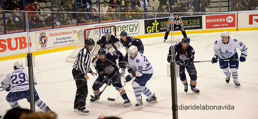 El equipo principal de la ciudad son los Toronto Maple Leafs, que juegan en la NHL (National Hockey League), pero aconsejados (como siempre de manera genial) por Martí y Anna, decidimos ir a ver un partido de los Toronto Marlies que juegan en la llamada segunda división del hockey, la AHL (American hockey League). La razón es que los precios de las entradas valen la mitad, y nos han explicado que se dejan la piel en cada partido porque es la puerta de entrada a la liga principal. La mayoría de partidos son mucho más intensos!