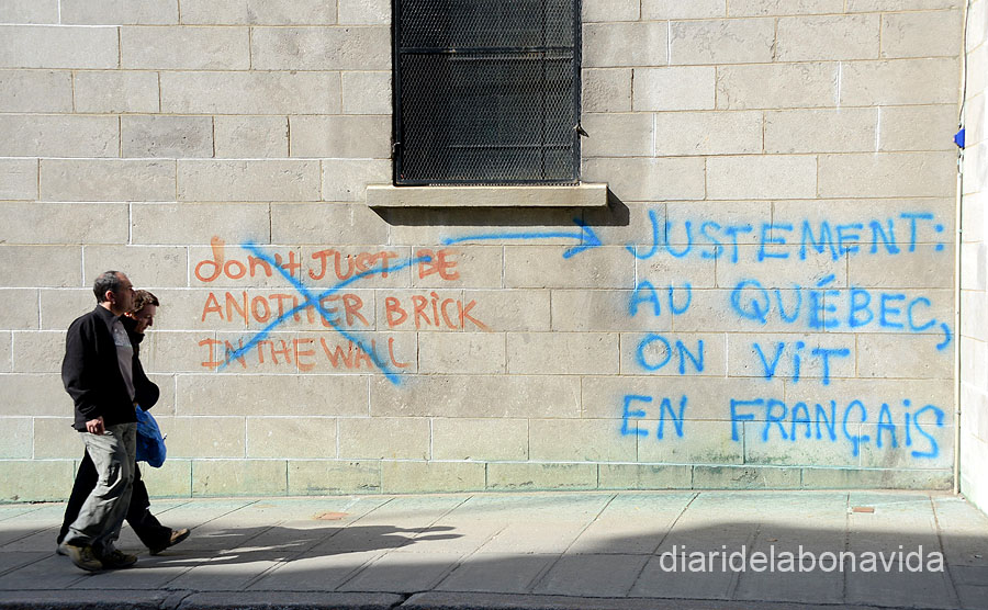 En respuesta a una pintada en inglés («No seas un ladrillo más en la pared»), podemos leer «Precisamente: en Québec vivimos en francés»