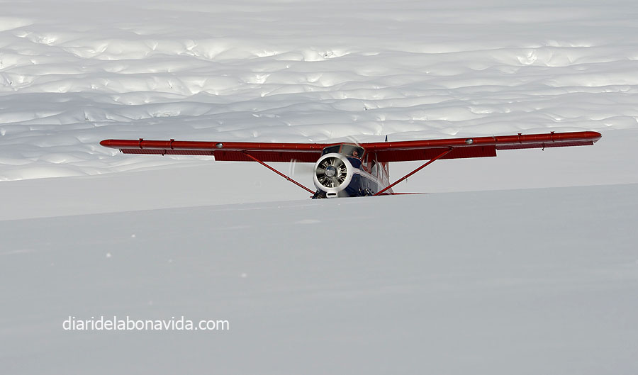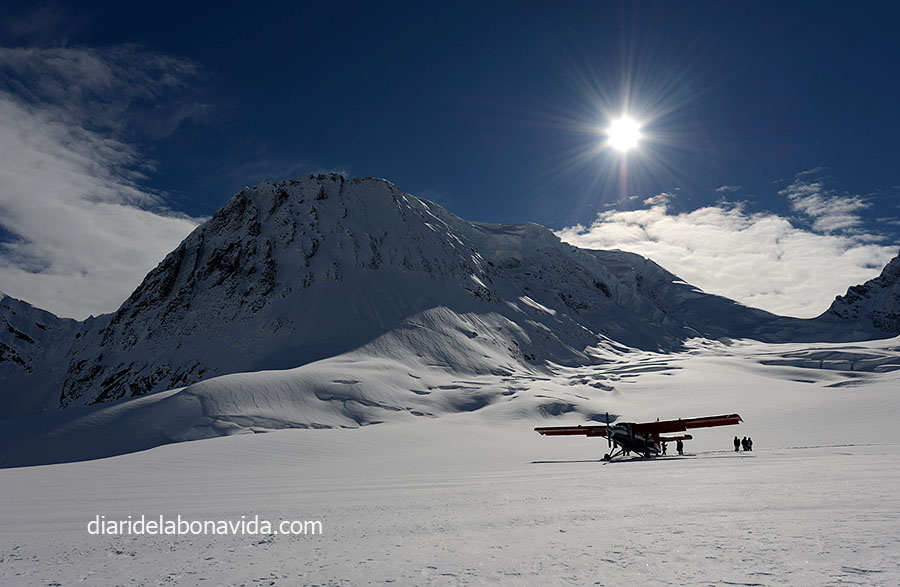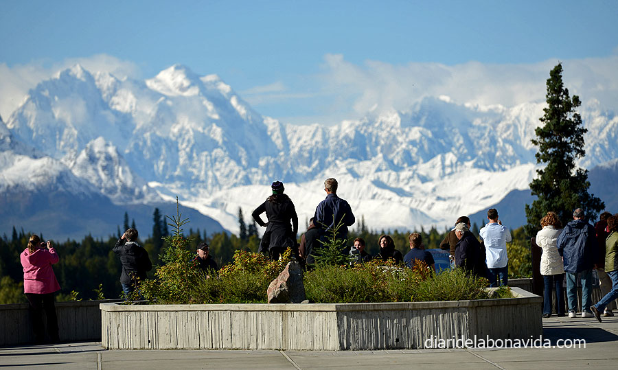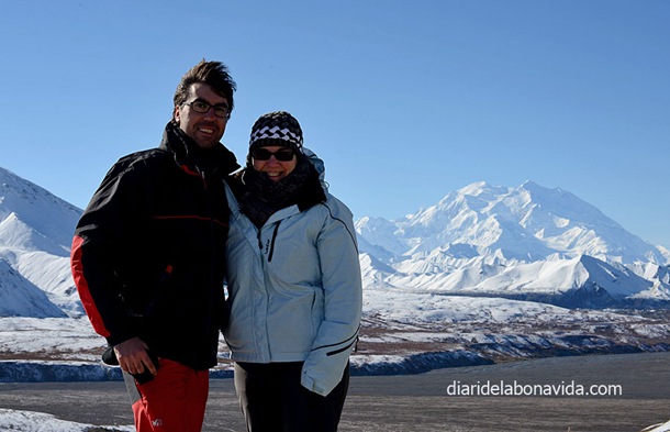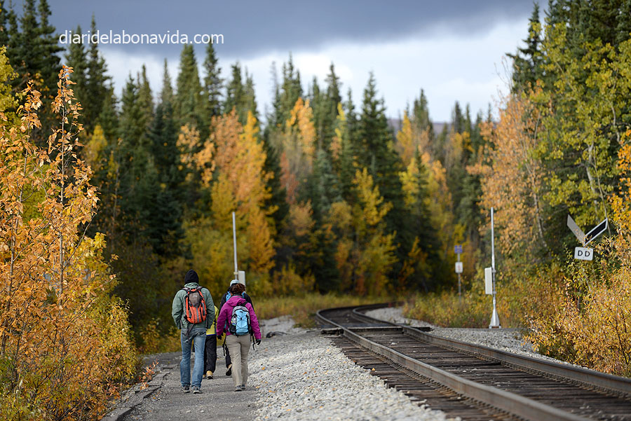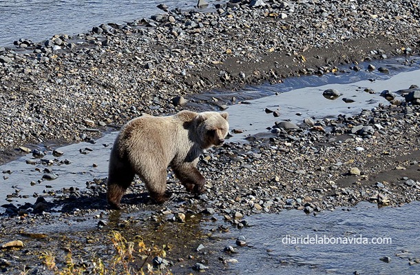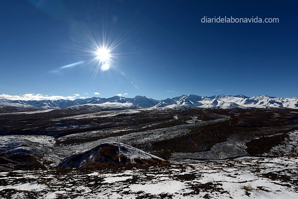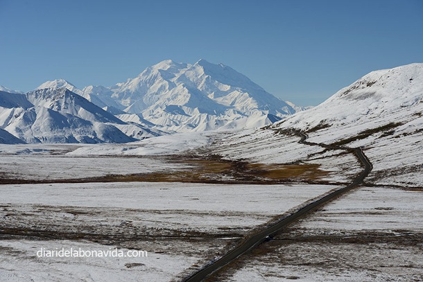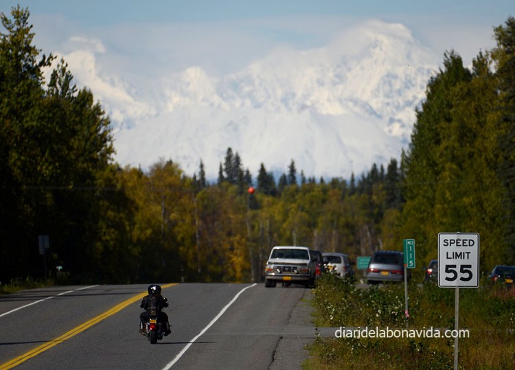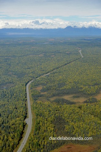 El día sigue siendo claro (no nos lo acabamos de creer) y hemos podido ver con total claridad los 3 picos más importantes del Alaska Range: Mt. Deborah (3.761 metros), Hess Mountain (3.639 metros) y Mt. Hayes (4.216 metros). También nos impresiona la «Pipeline», la tubería que lleva el petróleo que se extrae del norte de Alaska y que llega hasta Valdez, junto al mar, donde desde allí se reparte en el resto del país en barco. Nada menos que 1.287 kilómetros de tubería (como si fuera de Barcelona a Normandía, en Francia…).