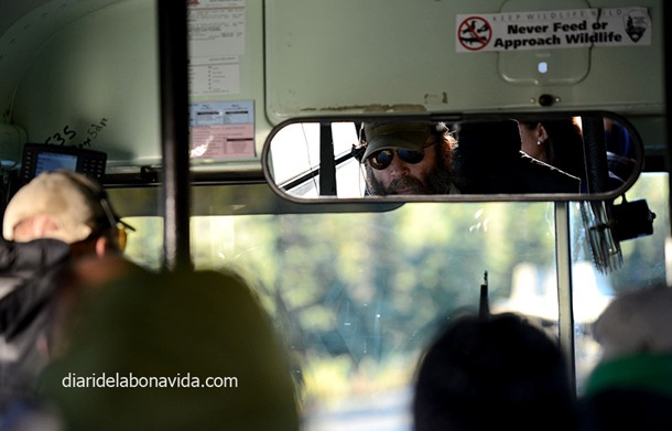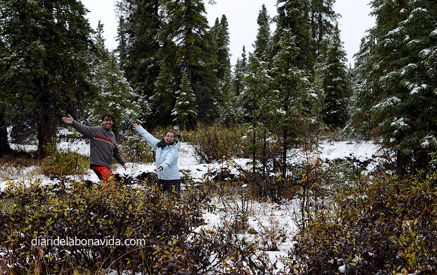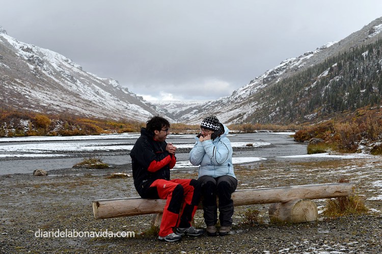 Hacemos más de una parada durante el camino para descansar un poco y tomar fotos, y comprobamos lo que habíamos leído en más de una guía. Junto al ríos y lagos, está lleno de unas pequeñas moscas (o mosquitos un poco diferentes…) muy molestas. Y eso que en septiembre dicen que ya no hay tantos, pero en verano es mucho peor!