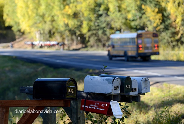 Volvemos a poner gasolina y limpiamos los cristales en el pueblo de Delta Juction, donde estamos a punto de quedarnos a pasar la noche. Pero como sólo son las 18:30h, decidimos continuar un poco más y finalmente nos detenemos en el Donnelly Creek State Recreation Site. Son unas zonas de acampada estatales, donde sólo encuentras un terreno delimitado en parcelas y unos pequeños aseos (bueno, mejor dicho, un enorme agujero en el suelo). No disponen de electricidad ni duchas ni ningún tipo de servicio. La finalidad es sólo un lugar donde pasar la noche. Lo bueno es que están en plena naturaleza, y son muy baratos. 10 dólares que tienes que depositar en una caja y llenar un formulario tu mismo con los datos.