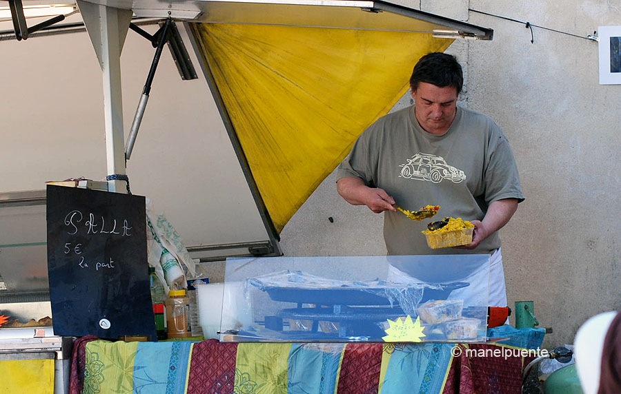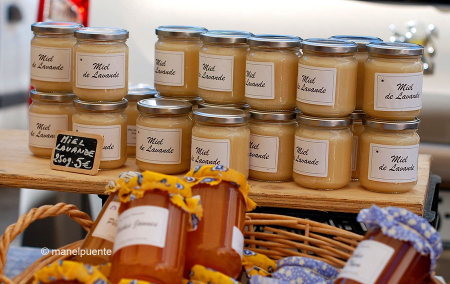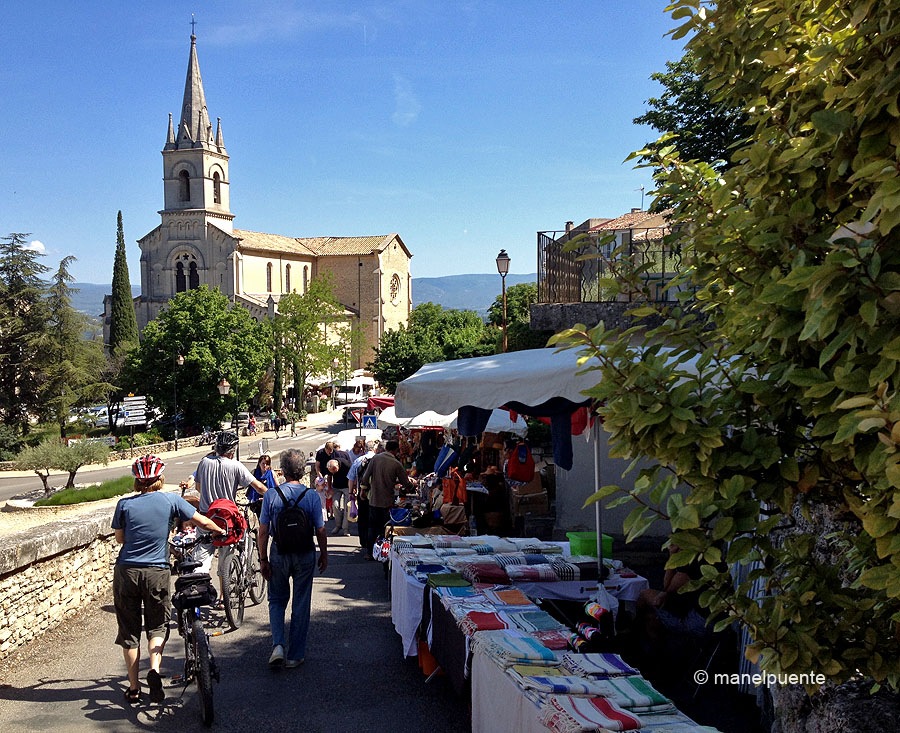 Sota l’església nova i als principals carrers del poble es munta el mercatVoltem i comprem alguns productes localsArtistes de la zona també tenen parades al mercatLa mel, junt amb l’oli, un dels productes que vam comprarTot i no escriure bé el que venien, la paella es va vendre rapidíssimL’església nova vista des del mirador de l’església vellaEl formatge de cabra de Luberon, boníssim!!!