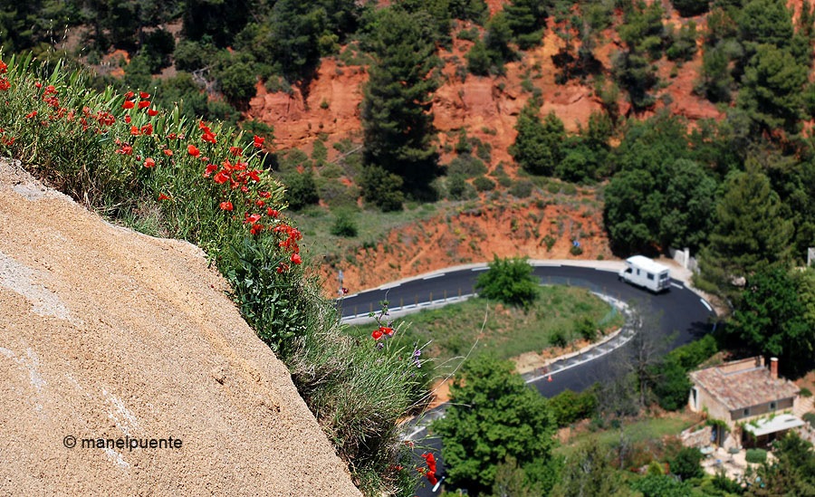 La carretera D900 ens condueix per una bonica ruta, i passem per pobles com Apt. Entrem de ple al Parc Natural du Luberon, i decidim visitar i dinar al poble de Roussillon. Situat a les muntanyes de Vaucluse, aquest bonic poble és conegut sobretot pel seu jaciment d’ocre, un dels més importants del món. Aquest pigment natural es troba barrejat amb la sorra de les muntanyes i té una importància enorme a la zona, i fins i tot hi ha la ruta anomenada “Sentier des Ocres”, per passejar entre arbres i petites formacions rocoses d’ocre. També es poden aprendre més coses sobre la utilització d’aquest material a la construcció o com a matèria primera a la pintura.