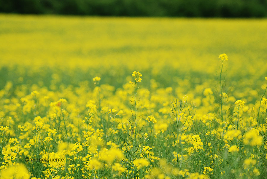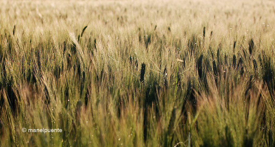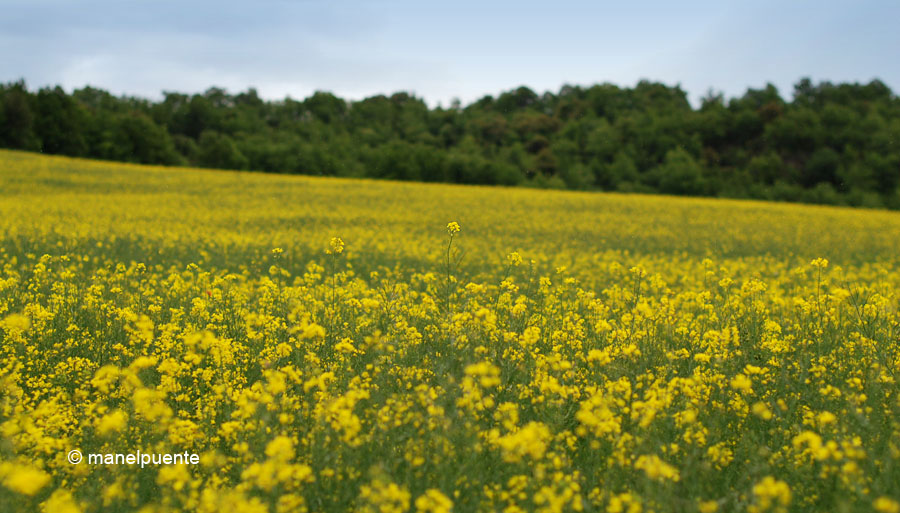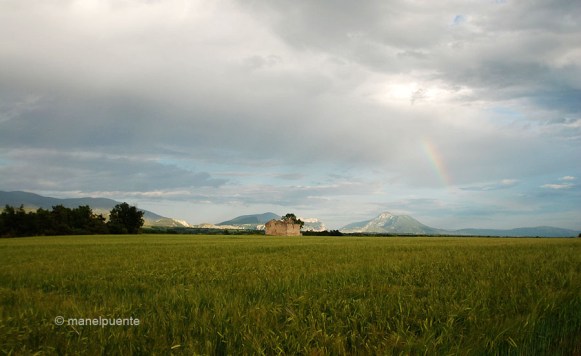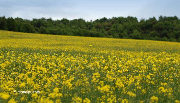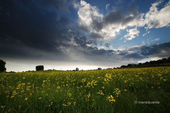 Després de la pluja, els núvols es van obrir i van deixar pas a un bonic solLes gotes d’aigua encara feien més bonics els camps de blatEls núvols van deixar pas a un vespre ben bonicDetall dels camps de flors grogues que ens acompanyaven duran la ruta