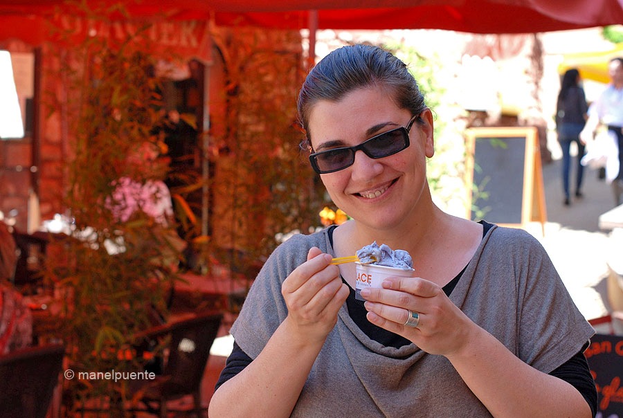 Les cases, totes de tons vermells, grocs i marrons, juntament amb les muntanyes i jaciments d’ocre, creen un contrast pictòric únic quan ho sumem al verd de la vegetació i al blau intens del cel. Quants colors! Dinem en un turístic restaurant, on per sort, i com ens passa sovint en aquestes escapades de temporada baixa, encara no ens trobem amb molta gent. Aprofitem per comprar uns gelats (un d’ells amb gust a lavanda! Boníssim!) i continuar la passejada fins a un mirador des d’on tenim unes bones vistes de la vall. Ah! I també trobem un petit mercat de productes artesans que es fa cada dijous fins a les 13h.