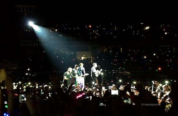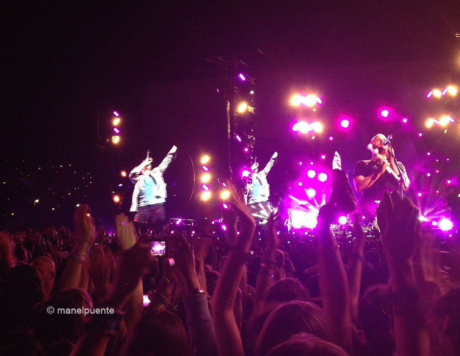 La sorpresa més gran de la nit, ve a mig concert. Estem situats a la gespa de l’estadi, a mitja distància de l’escenari, i com tots aquest grans concerts, o ets al davant de tot o gairebé has de seguir el concert per les enormes pantalles muntades. I jo encara puc veure bastant bé al grup, però la Cristina (que no vull dir que sigui petita, però tampoc és molt alta -ja m’enteneu-) sempre té un munt de caps al mig que tapen la seva visió. Doncs bé, després d’una pausa, amb tot l’estadi a les fosques, de cop i volta comença una nova cançó però no veiem a ningú. On són? I em giro al darrera i els veig allà, a pocs metres nostres, damunt d’un petit escenari que han muntat per oferir un parell de cançons entre el públic. Llàstima que Murphy sempre m’acompanya amb les decisions fotogràfiques. M’explico: Si arribo a voler entrar al concert amb la càmera de fotos gran, segur que m’hauria trobat problemes a l’entrada, com m’ha passat a d’altres llocs. És per això que vaig optar per deixar-la al cotxe, però la llei de Murphy diu que si no l’agafo, no hauria tingut cap problema per entrar-la amb mi. De fet al voltant nostre hi havia diverses persones amb càmeres professionals. I jo només tenia el mòbil per fer-los fotos quan segurament mai més els tornaré a tenir tan a prop meu. Quina llàstima!