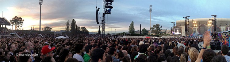 I un cop a dins, comença l’espectacle. Abans actuen la cantant Rita Ora i el grup Marina and the Diamonds, i no és fins les 22h que surten els protagonistes de la nit. Apoteòsic, genial, brutal… no tenim paraules per definir l’actuació. En directe son boníssims, i es nota que saben el que és un espectacle audiovisual. No paren d’oferir sorpreses: focs artificials, globus, llums… i 45.000 persones que no paren de cantar i animar!