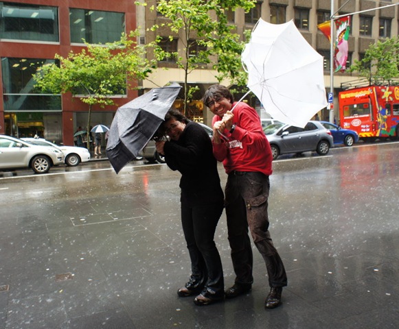Y nos empieza a llover a cántaros. Justo cuando queríamos continuar pateando las calles, el agua nos lo impide!